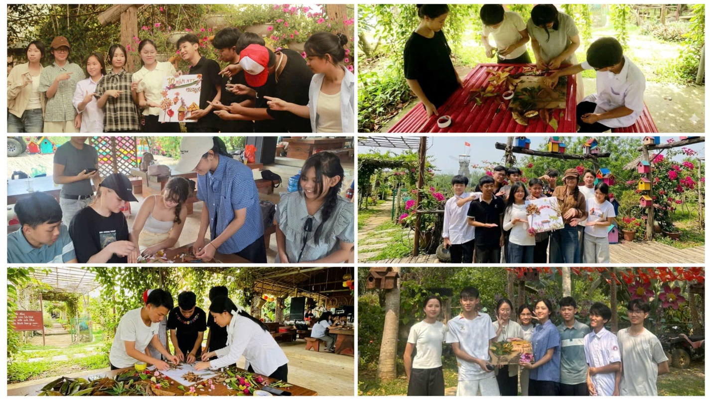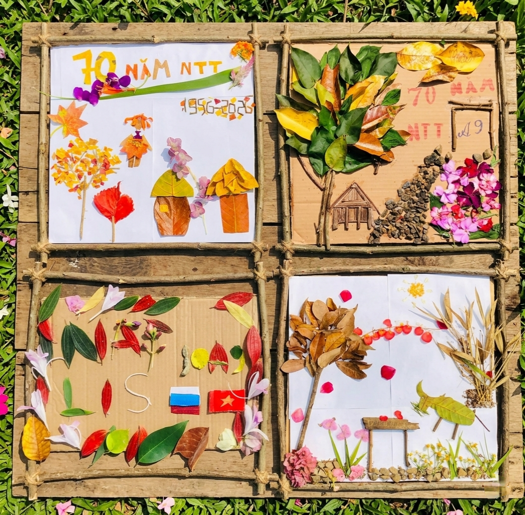 Điểm nhấn ấn tượng nhất trong hành trình chính là hoạt động trải nghiệm sáng tạo “Tạo hình từ lá cây” với chủ đề hướng tới kỷ niệm 70 năm thành lập Trường PTDTNT THPT tỉnh Điện Biên, đồng thời lan tỏa thông điệp giáo dục ý thức bảo vệ môi trường. Từ những nguyên liệu tự nhiên sẵn có tại Đào Viên Sơn như lá rụng, cành khô, sỏi đá…, 38 thành viên của lớp đã cùng nhau sáng tạo nên những tác phẩm nghệ thuật độc đáo, giàu ý nghĩa. Mỗi sản phẩm không chỉ thể hiện sự khéo léo, tinh thần đoàn kết mà còn gửi gắm tình cảm tri ân mái trường, hướng về chặng đường 70 năm phát triển. Hoạt động đã góp phần nuôi dưỡng lối sống xanh, nâng cao ý thức trách nhiệm của học sinh trong việc gìn giữ và bảo vệ môi trường.