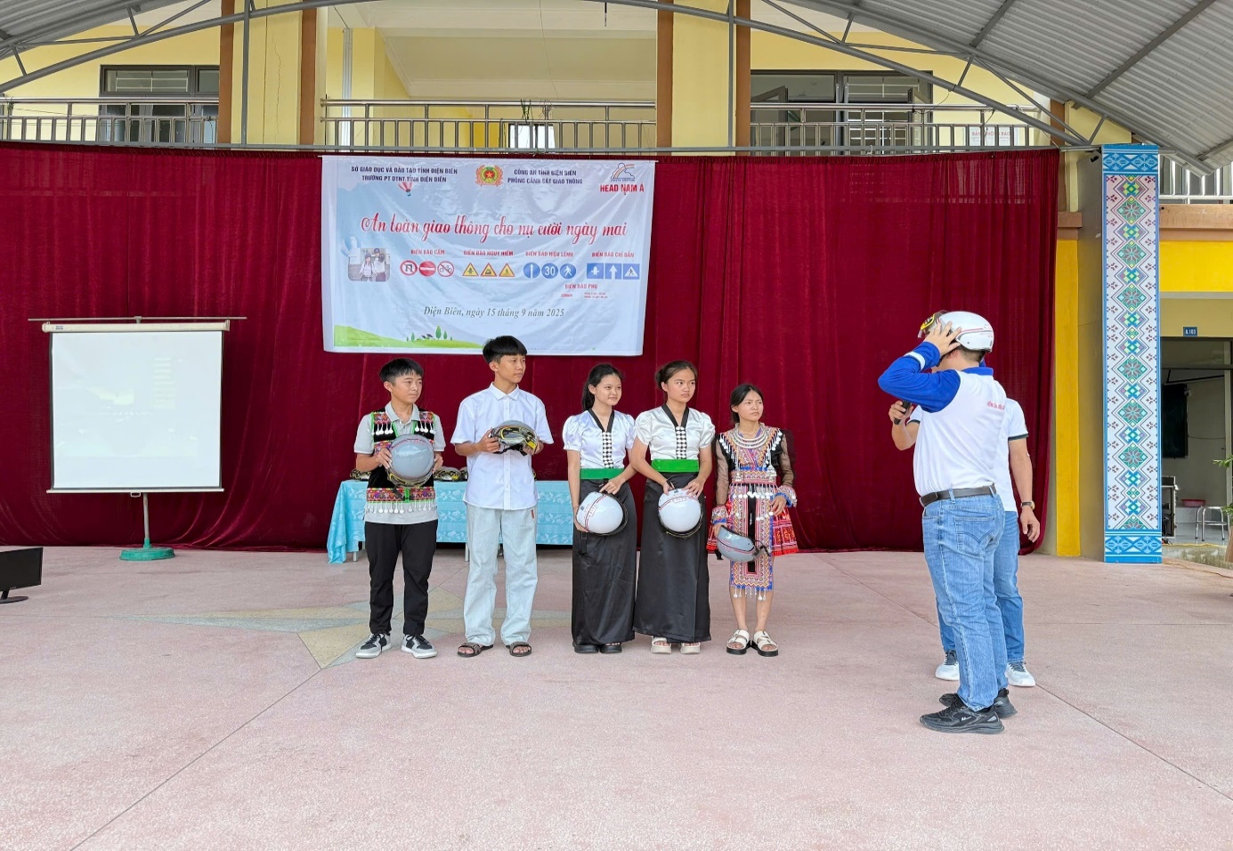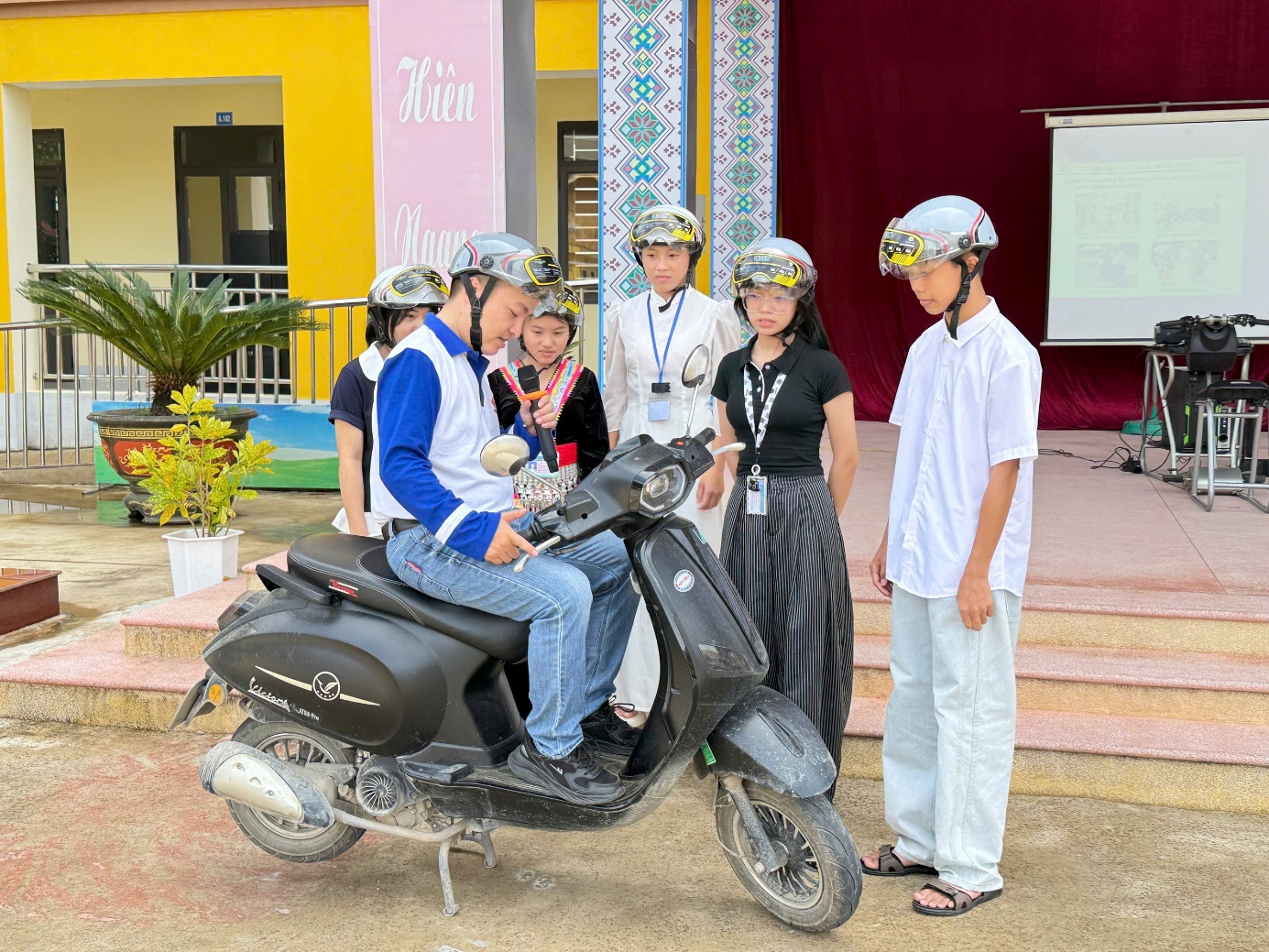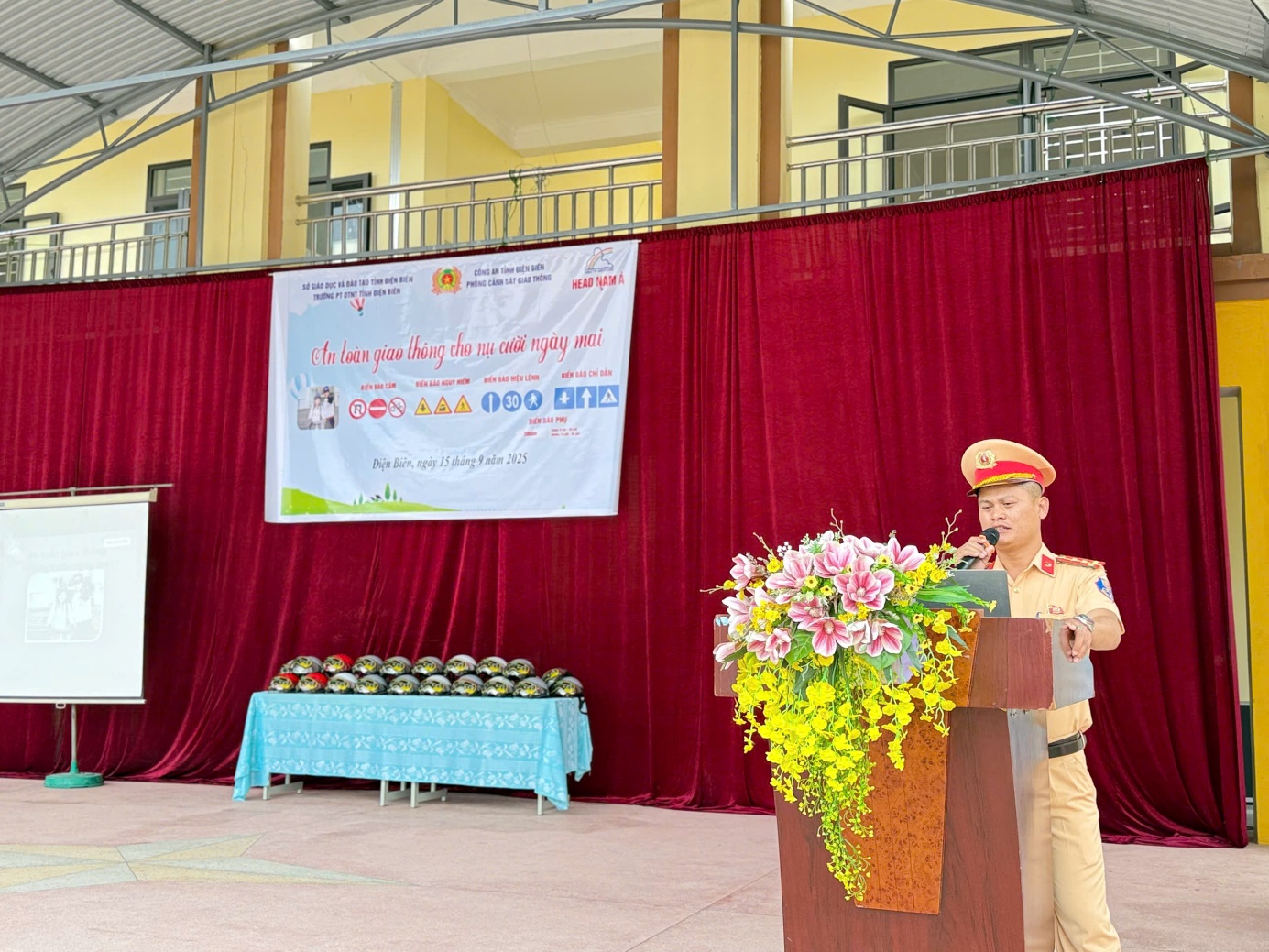 Về phía Công an tỉnh Điện Biên, đồng chí Trần Thanh Tùng - Cán bộ Đội Cảnh sát giao thông đã trực tiếp tuyên truyền, phổ biến các nội dung cơ bản của Luật giao thông đường bộ; phân tích những hành vi vi phạm thường gặp, nguyên nhân dẫn đến tai nạn giao thông và những hậu quả nghiêm trọng. Đồng chí nhấn mạnh vai trò, trách nhiệm của học sinh trong việc chấp hành nghiêm chỉnh luật giao thông, đặc biệt là quy định bắt buộc đội mũ bảo hiểm, không điều khiển xe khi chưa đủ tuổi, không phóng nhanh vượt ẩu, không tụ tập gây mất trật tự công cộng.