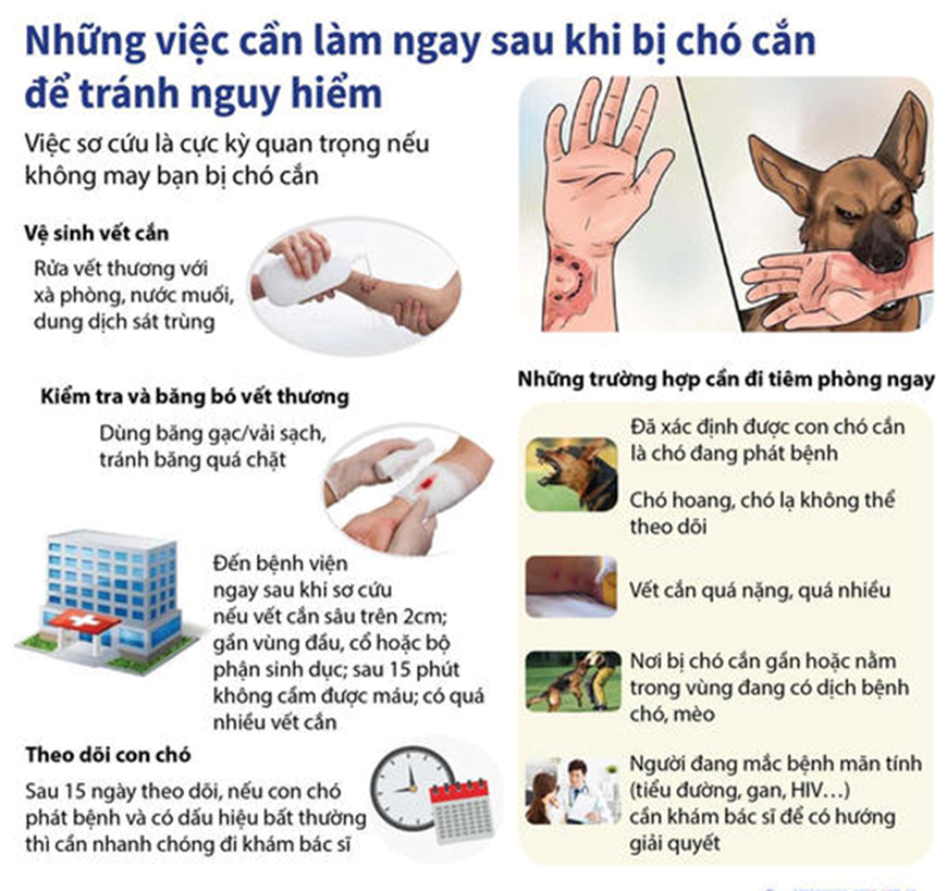 - Khi bị cắn cần sơ cứu theo các bước ngay lập tức và đến cơ sở y tế để được khám và tiêm phòng.