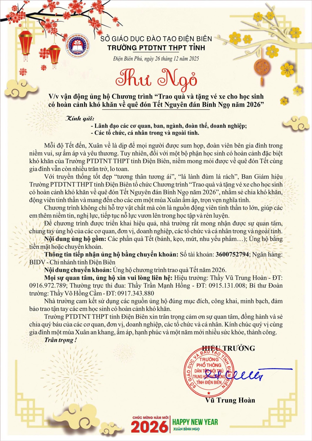 Nhằm chung tay chăm lo Tết cho học sinh có hoàn cảnh khó khăn, nhà trường trân trọng kêu gọi các tập thể, cá nhân, cựu học sinh và các nhà hảo tâm quan tâm, ủng hộ.