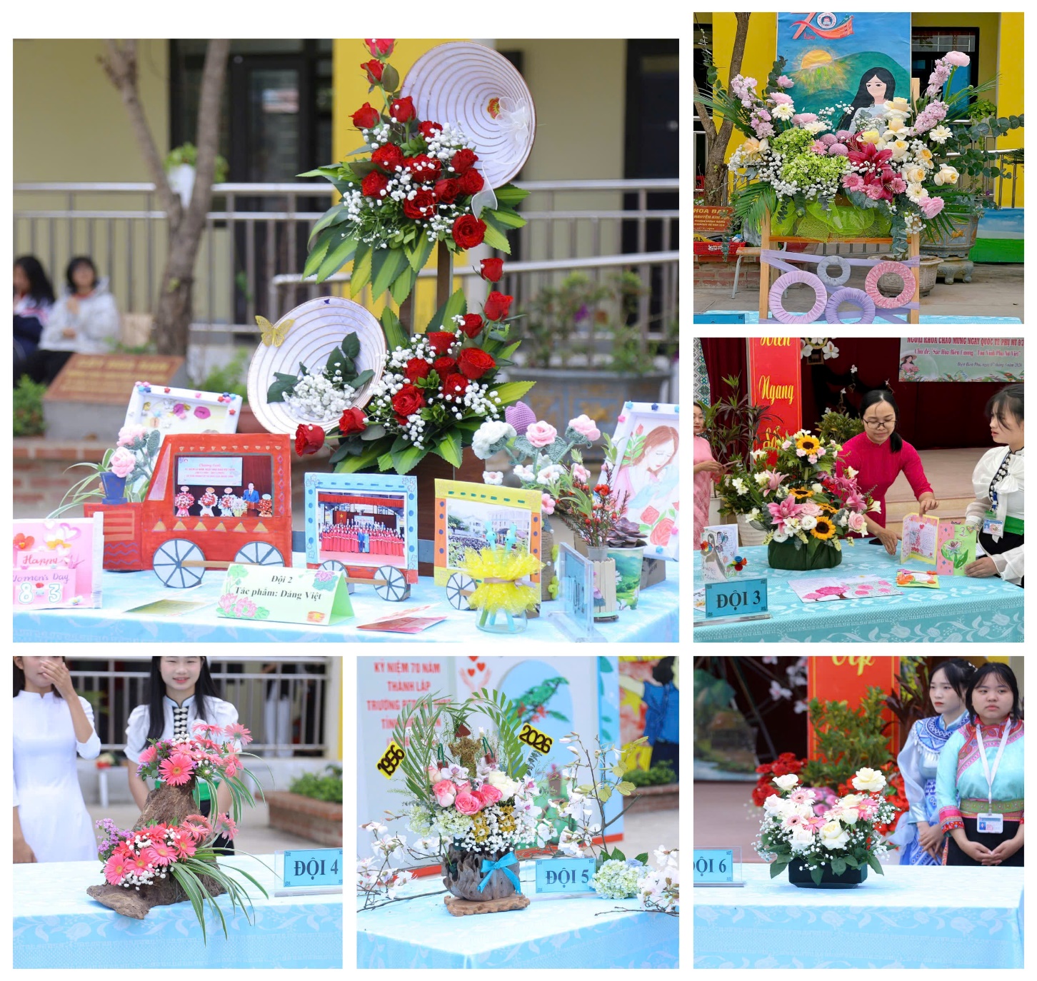 Trong 30 phút, bằng đôi bàn tay khéo léo và óc sáng tạo, các đội thi gồm 3 giáo viên và 2 học sinh đã tạo nên những tác phẩm đầy tính thẩm mỹ. Nhiều đội đã gây ấn tượng mạnh khi sử dụng vật liệu tái chế để trang trí không gian, gửi gắm những thông điệp ý nghĩa về tình yêu quê hương, lòng biết ơn thầy cô và ý thức bảo vệ môi trường qua phần thuyết trình đầy cảm xúc.