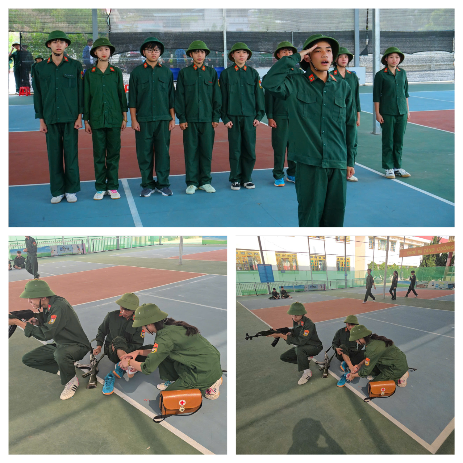 Đối với khối lớp 10, học sinh tham gia các nội dung: đội ngũ từng người không có súng; kỹ thuật cấp cứu và chuyển thương, yêu cầu thí sinh thực hành băng bó vết thương và vận chuyển người bị nạn theo đúng quy trình kỹ thuật.